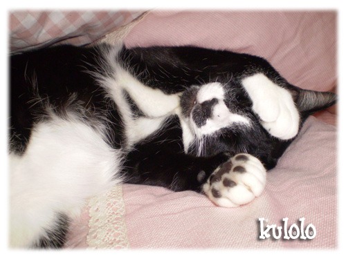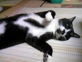 居候猫、クロロには変なクセがあって、誰かが帰宅すると写真に写っている状態のようにゴロンと寝る。